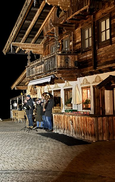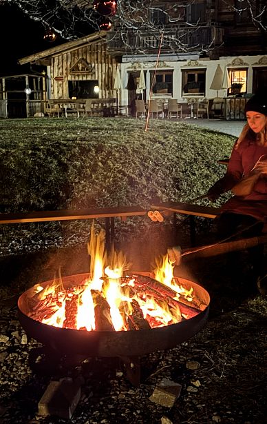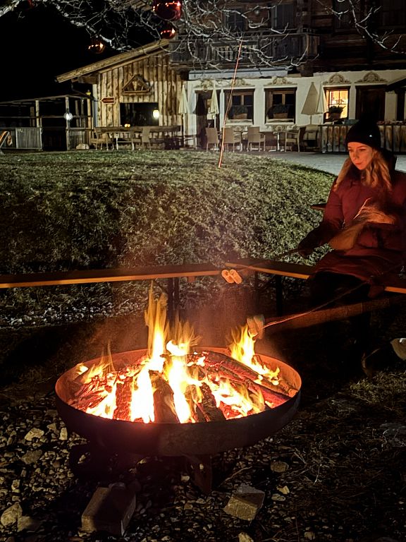 Auf der Alm angekommen, erwartete die Gäste Glühwein, Punsch und ein wärmendes Lagerfeuer. Marshmallows konnten über den Flammen geröstet werden, während Sängerinnen und Weisenbläser mit alpenländischen Klängen für eine stimmige musikalische Umrahmung sorgten.