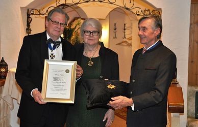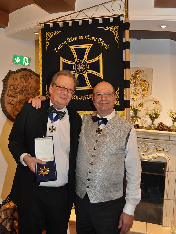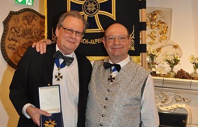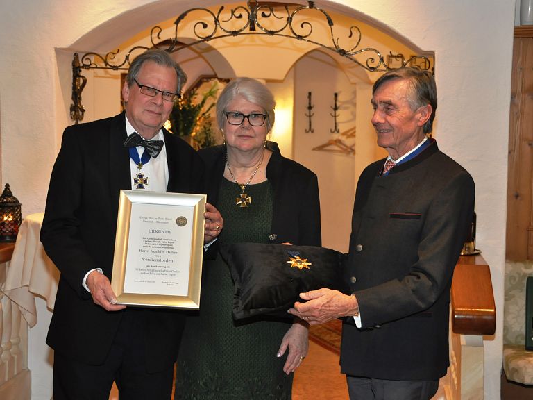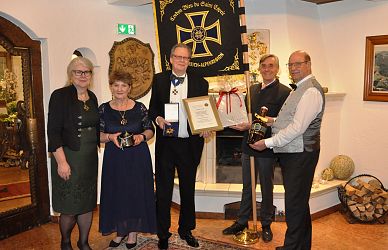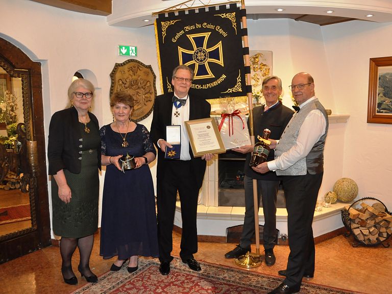 Großen Applaus ernteten die beiden Postulanten Silke Krummrich und Udo Schwieren nach ihrer sympathischen Vorstellung. Danach informierten Vizeregent MR Dr. Franz Pistoja und Mag. Christopher Innerkofler über ein gemeinsames Hilfsprojekt mit der Weinritterschaft und der Gemeinde Kirchdorf. Unterstützt wurde diese wohltätige Aktion durch eine Spende von Großmeister Roland Hacker vom Deutschen Ritterorden St. Georg. Ein weiterer Höhepunkt folgte mit der Ehrung von Schatzmeister und Ordensnotar Joachim Huber. Er trat bereits 1975 in den humanitären Ritterorden Cordon bleu du Saint Esprit ein und leistet seit fünfzig Jahren einen wertvollen aktiven Beitrag.